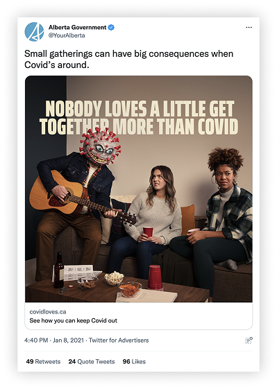 Covid loves birthday parties, weddings, game night, baby showers, house parties, Christmas dinners, first dates, guys nights, etc. If people are getting together, it's most likely Covid will be joining. During the peak of the pandemic, we turned this important message into a demonstration through a personified version of the COVID-19 virus. A total social butterfly, Covid showed up to every kind of get together, big or small, to help Albertans see the problem in an entertaining and unexpected way.